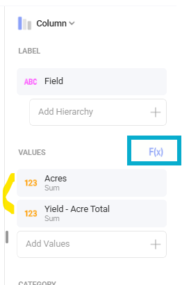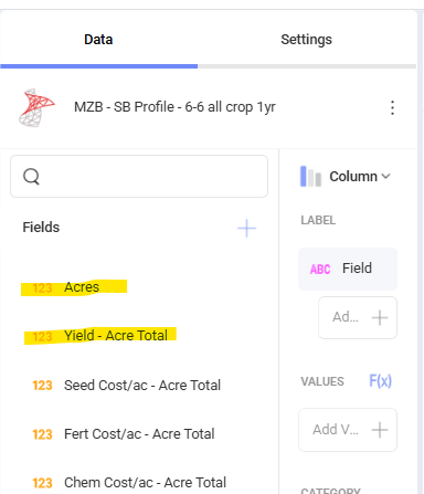 - In edit mode on a visual, add Acres and whichever attribute you want to create a weighted average for. Here, I’ll use Yield - Acre Total to demonstrate: