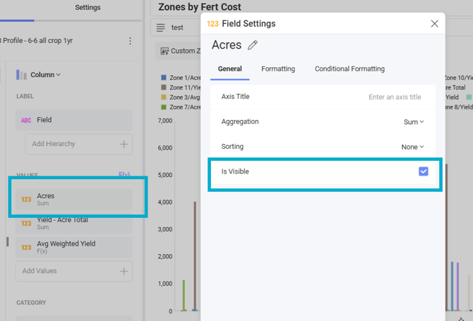 - Next, you’ll hide the Acres and Yield - Acre Total column from your graph so they don’t display. Click the value for Acres, uncheck the box ‘Is Visible.’ Do the same for Yield - Acre Total.