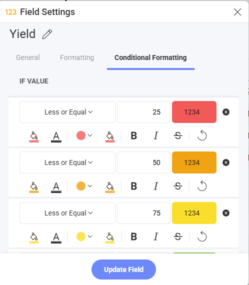 In order to apply formatting to a pivot chart for, in this example, yield data, you can utilize either actual values or percentages:
