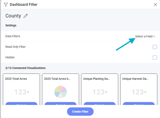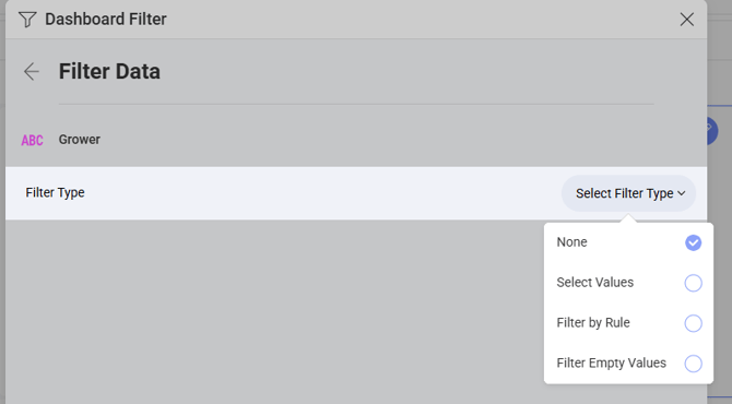Tip: In order to create benchmarking visuals, you may choose to apply a Grower filter to some visuals, but leave other visuals at the large group level and be sure to name them correctly. This way, when you filter at the top of your dashboard, some visuals will reflect how a grower performed against the group.