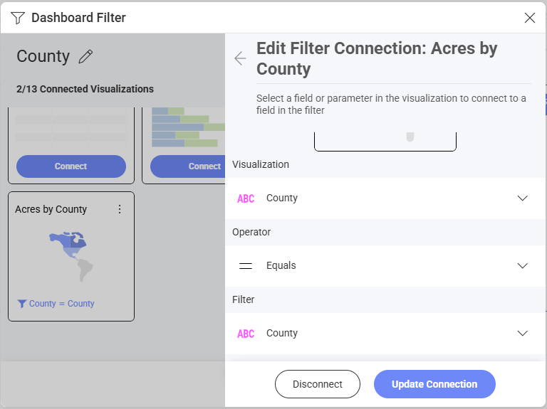 In both cases, binding is defined by adding rules that link a field in the dashboard filter dataset with a corresponding field in the visualization's dataset (field binding). You can always remove a visualization's binding by selecting Disconnect in the Visualization Editor or the Dashboard Filter menu.