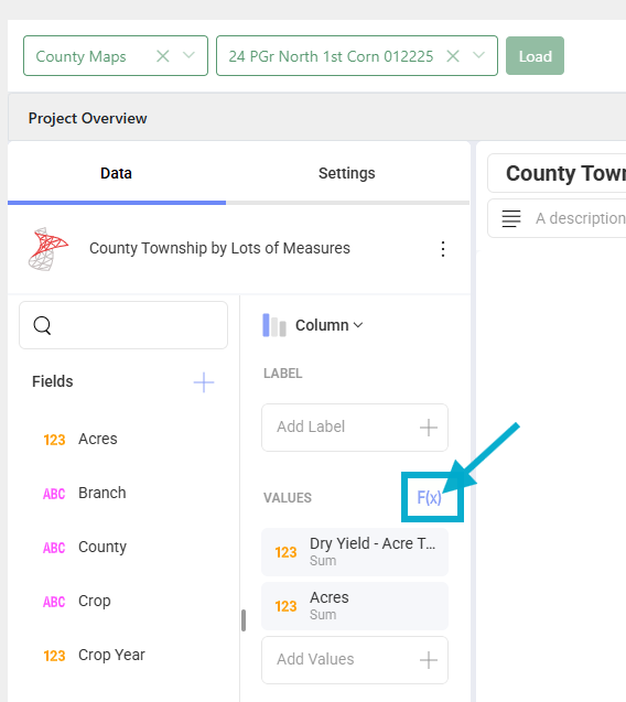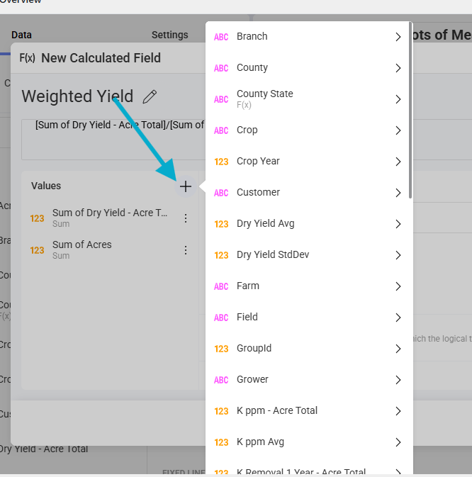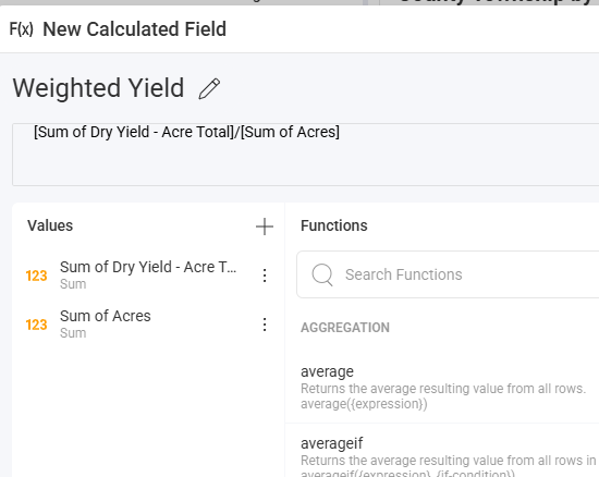 3. Give a name to your new calculated field and apply a formula to the summarized value(s). Pay attention that the list of Values includes the data fields you used in your visualization after they have been aggregated (Sum of Dry Yield Acres, Sum of Acres, etc.).
