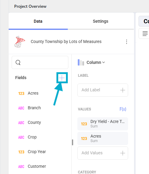 If you need to use other fields from your data source, that are not included in the Data Editor, you can add them by clicking/tapping on the + button next to Values. Since post-calculated fields are created only by using aggregated values, you will first need to select an aggregation from the dropdown list to be executed on the data field.