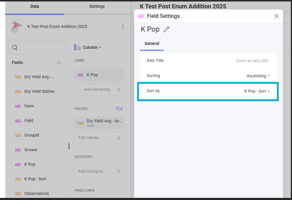 PCS has added a column that can be easily utilized for sorting your data once in a chart, given that sometimes sorting simply by ascending or descending for an attribute that has custom classifications can result with incorrect sort orders. There is a column called “[dimension name] - Sort” automatically added for every dimension in your query that will utilize the order of your classifications as they were set up in the query.
